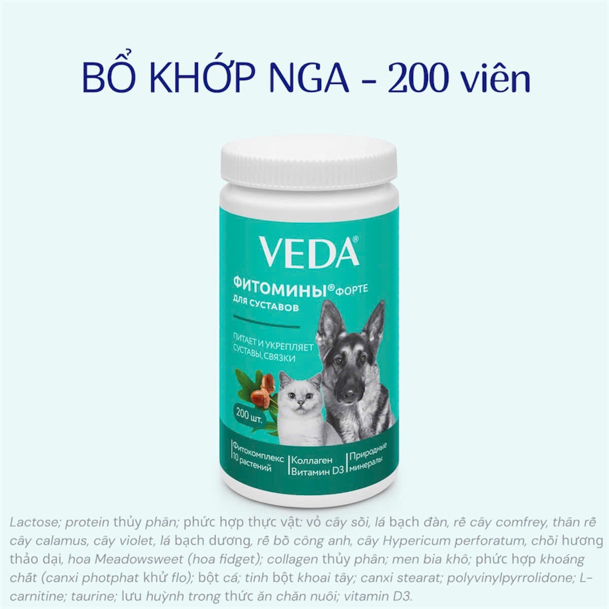 Lactose; protein thủy phân; phức hợp thực vật: vỏ cây sồi, lá bạch đàn, rễ cây comfrey, thân rễ cây calamus, cây violet, lá bạch dương, rễ bồ công anh, cây Hypericum perforatum, chồi hương thảo dại, hoa Meadowsweet (hoa fidget); collagen thủy phân; men bia khô; phức hợp khoáng chất (canxi photphat khử flo); bột cá; tinh bột khoai tây; canxi stearat; polyvinylpyrrolidone; L-carnitine; taurine; lưu huỳnh trong thức ăn chăn nuôi; vitamin D3.